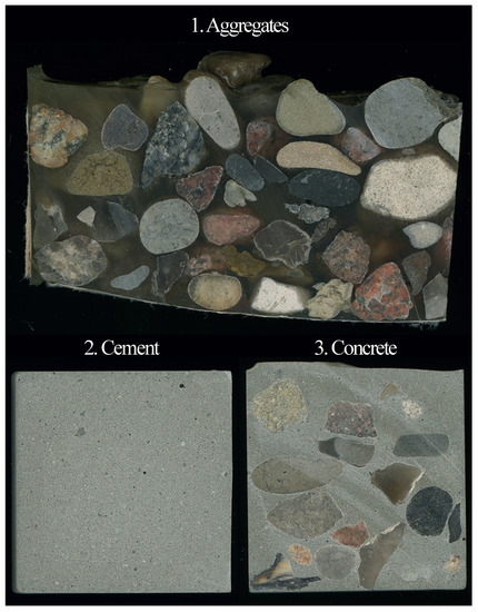 - Aggregate specimen, comprised of aggregates and epoxy resin to exclusively characterize the aggregate and its variation by selected element distributions. Aggregates from various types with grain size in a range of 8–16 mm were filled in a paper cup and epoxy-resin was added to cover the gravels. Epoxy is a homogeneous polymer which similar to concrete contributes to the stabilization of the aggregates in the mixture. The homogeneity and the chemical composition of the epoxy resin allows an easy differentiation of the analyzed data in terms of epoxy or aggregate. This provides the basis for an adjusted data set. Due to this approach it was possible to investigate the different types of aggregate simultaneously, which facilitated the analysis. The used aggregates are classified as pyrogenic rock, migmatite, and gneiss with the main minerals feldspar (plagioclase), quartz, and mica.