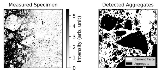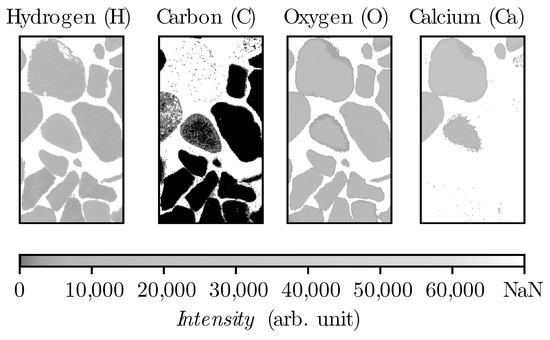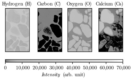 To train the algorithm a virtual concrete consisting of the two data-sets of sample type (1) and (2) have been measured and labeled. The first data set represents aggregates and the second one hydrated cement paste. From the sample type (1), the epoxy resin has been removed with thresholding the intensity for each element (H, C, O, Ca) as is shown in Figure 5.