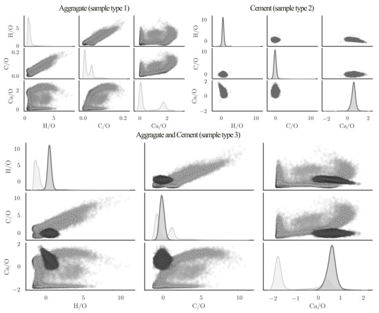 Figure 4 illustrates different elements in pairwise plots in which the diagonal plots are representing the distribution of data with kernel density estimation (KDE) function. The elements of the hydrated cement are homogeneously distributed and as a result the derived element ratio appear concentrated within the given plots. On the contrary, aggregates have a wide distribution of elements and their content and therefore the evaluated element ratios scatter in different degrees (see Figure 4).