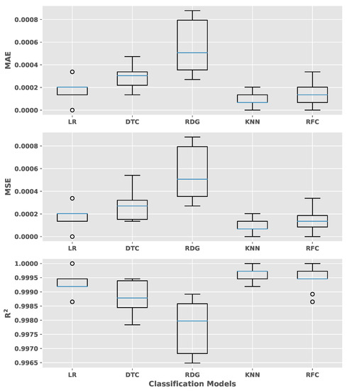 A cross-validation for the evaluation the performance of the model has been performed and compared with different algorithms. The kNN algorithm showed an outstanding performance among Logistic Regression, Decision Tree, Ridge, and Random Forest. Mean absolute error (MAE), mean squared error (MSE), and the coefficient of determination () scoring metrics have been evaluated to check the effect of the outliers on performance (see Figure 7). The kNN algorithm has shown the highest value in all metrics compared to the other algorithms.