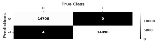 A testing of the trained model was performed with different test data sets from type 1 samples, consisting of aggregate and resin. The evaluation of these data showed a high accuracy with a recall value above 99% as the predicted and true class values are illustrated in the confusion matrix (see Figure 8).