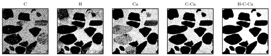 In order to avoid losing data points after data removal linked to epoxy, the empty points within the aggregates have been filled up with the value of zero, by masking the oxygen layer to them (see Figure 6). By this procedure, the aggregates without hydrogen, carbon or calcium will also be detected. To avoid biasing in training, these data-sets have been leveled equally to the size of 74,000 samples in each set by random selection. These two sets were merged and shuffled together.