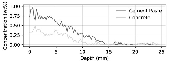 The determination of chloride content in reinforced concrete structures is a very important component in the field of maintenance and vulnerability analysis of existing reinforced concrete buildings. Chlorides can reach a building component, if exposed to deicing salt or sea water. Then they are able to penetrate into the concrete and over time may reach the reinforcement. If a critical chloride content is exceeded at the reinforcement bar, it may start to corrode. This has led to extensive damages and repair in the past. A reference value for this critical chloride content is defined as 0.5 wt.%/cement [7]. Therefore, a precise determination of the chloride distribution within the concrete cover of existing buildings may have a huge impact on the proposal of retrofit solutions or the residual service life calculated on the basis of these test results. To determine the chloride content, usually concrete powder is extracted from the structure by drilling. These powder samples are then further examined in the laboratory. Common approaches to measure chloride content are potentiometric titration, direct potentiometry, and photometry, which are all advised by the European Standards [8,9,10,11]. However, with these analytic methods no additional differentiation between cement and aggregate is possible. Hence, the results are related to the whole sample mass being concrete, but as explained before the chloride concentration needs to be related to cement. Therefore the analysis values have to be converted from wt.-%/concrete into wt.-%/cement, which requires the knowledge of the concrete composition in the analyzed concrete powder samples. Since this information is rarely available, assumptions for a conversation factor have to be made. This applies to the majority of cases where concrete samples are taken from existing structures. Due to this procedure the result in the decisive unit may be inaccurate although the analysis method itself is very precise. By excluding the aggregate within the examinations process, more reliable values for the chloride content in cement would be achievable. This would lead to optimized repair scopes and to more accurate estimates of the remaining service life, since the estimated remaining service life is based on the distribution of chlorides within the concrete cover.