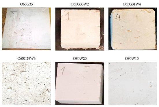 According to Section 2.3.2 of PN-B-19305 [14], the release agent should not cause any change in the color of the concrete (stains, crystalline efflorescence) on any of the three tested samples. Figure 3 shows the surface condition of the architectural concrete after unmolding the samples.