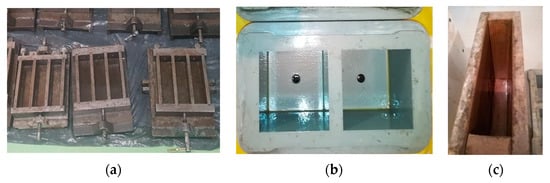 Molds covered with mold release agents: (a) steel molds, (b) plastic molds, (c) wood panel molds.