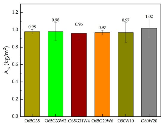 The measurements of the η coefficient showed that the agent O65G31W4 had the highest dynamic/kinematic viscosity, while the agent O90W10 had the lowest. For comparison, the kinematic viscosity of rapeseed oil methyl ester at 20 °C is 7 mm2/s [27]. The high viscosity makes the newly produced release agents less likely to runoff from sloping and lateral mold surfaces.
