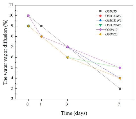 The test showed that the tested release agents did not inhibit water vapor diffusion from the tested specimens (Figure 7). After 7 days, the moisture content was between 3 and 6%. In the case of architectural concrete, water vapor diffusion is faster, and this is due to the lower w/c of the concrete as well as the admixtures that are used in its production.