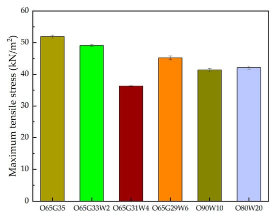 The mold release oils did not seal the structure of the concrete. All CA were lower than 90°, indicating the hydrophilicity of the concrete. The O65G35 concrete had the best wettability. In this case, the contact angle was 56°. For architectural concrete, the contact angle was much higher than for normal concretes or mortars described, for example, in the work of Barnat-Hunek et al. [42,43]. The disadvantage is not due to the use of oil but is due to the specificity of this type of concrete, the admixtures used, and the lower w/c ratio. Therefore, it can be concluded that the molding oils did not increase the wetting angle of the analyzed concrete surfaces. A different approach was taken in their work by Izarra et al. [44]. They focused on producing a release agent designed to create a hydrophobic layer on the surface of the concrete. The produced release agent by Izarra et al. [44] containing 3 wt% of MTEOS-2.5 (2.5—the molar ratio between the precursors methyltriethoxysilane (MTES) and tetraethyl orthosilicate (TEOS)) helped to produce mortar samples with contact angles greater than 145° with a good distribution of the release agent on the mortar surface. Song et al. [45] also examined the CA of commercially available release agents in their work. However, they investigated the contact angle not on the surface of the material but on the surface of the mold. In their work, they were concerned with release agents that, once applied, would allow the mold to be used repeatedly.