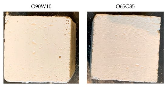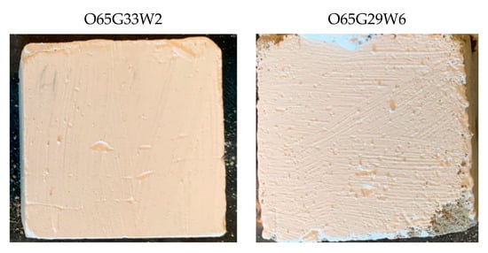 Analyzing the appearance of the agents, it can be stated that in the case of O65G35, no segregation of components or precipitate was observed, even a few days after production. The color of the agent with 10% water content (O90W10) changed to a more transparent, darker color, similar to natural oils. However, a slight precipitate was observed at the bottom of the container. As the amount of water in the mixture increased, turbidity of the substance was noticed. The individual components of the new agents mixed very well together. However, as time passed, a white precipitate appeared at the bottom of the container for O90W10, O80W20, and O70W30 and a pink residue for the agents with glyceryl trioleate and water. Due to too much segregation of the mold release agent with 30% water content, further studies decided to eliminate it.