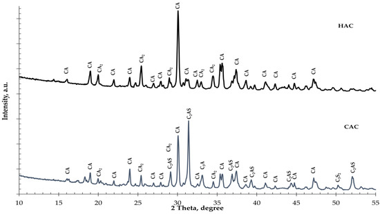 The X-ray diffraction results of cement types: High-alumina cement (HAC); calcium aluminate cement (CAC). (CA—CaO·Al2O3; CA2—CaO·2Al2O3; C2AS—2CaO·Al2O3·SiO2; C3A—3CaO·Al2O3; C3S2—3CaO·2SiO2).