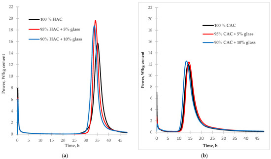 Two types of alumina cement with different mineral compositions were used for the tests. In high-alumina cement (HAC), the basic mineral components are monocalcium aluminate (CA) and dicalcium aluminate (CA2), while in calcium aluminate cement (CAC), these are gehlenite (C2AS) and monocalcium aluminate (CA). During the hydration of monocalcium and dicalcium aluminate, unstable hexagonal phases are formed which undergo a conversion process to create the stable phases of calcium hydroaluminate and aluminum hydroxide [1,2]. During the hydration of gehlenite (C2AS), only the stable stratinglite (C2ASH8) phase was formed. High-alumina cement is more susceptible to conversion than CAC due to its higher mineral monocalcium aluminate and dicalcium aluminate contents. The calorimetric study results of the investigation into the effect of fine glass on the hydration of two different types of aluminous cement are presented in Figure 2.