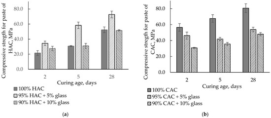The compressive strength for the paste of HAC and CAC with glass stored at 20 °C. (a) HAC-glass systems; (b) CAC-glass systems.