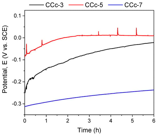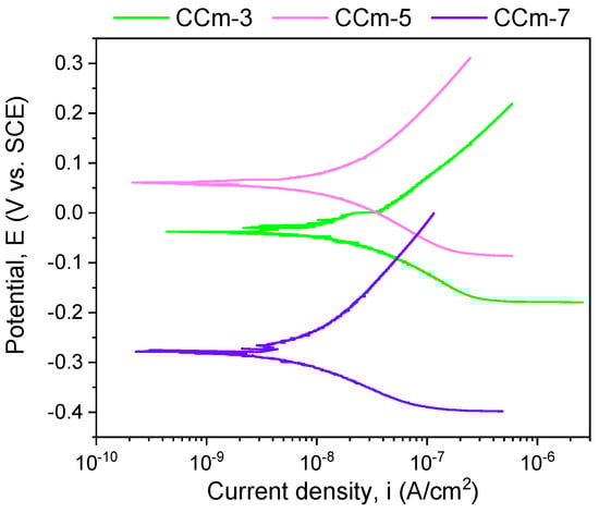 If we consider the value of the corrosion potential (Ecorr), it is known that a more electropositive corrosion potential indicates a better corrosion behavior. Thus, based on this criterion, the most electropositive potential (Ecorr) was registered in the case of the CCc-3 sample, with a value of −70 mV, followed by that of the CCc-5 sample.