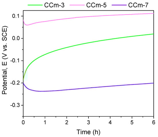 Regarding the milled Co-Cr alloy, the most electropositive open circuit potential was obtained for the CCm-5 with a value of 112 mV. By analyzing the allure of the open circuit potential, it can be observed, as in the case of cast Co-Cr alloy, that in all electrolytes, milled Co-Cr alloy tends towards more electropositive values. This can confirm the formation of a protective layer on its surface.