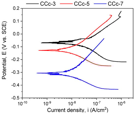 In terms of corrosion current density (icorr), a smaller value indicates a good corrosion resistance. Thus, considering this criterion, the lowest corrosion current density was obtained for the CCc-7 sample (9.098 nA/cm2), followed by that of the CCc-5 sample, with a difference of only 0.387 nA/cm2.