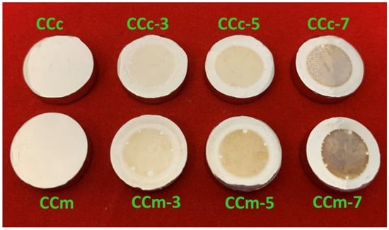 It is known that a high polarization resistance highlights a better corrosion resistance of a material, and a low value of this parameter has a weaker behavior. From this point of view, it is observed that the CCc-7 sample has the highest value of this parameter (3130.56 kΩ × cm2), thereby demonstrating a better corrosion resistance than the other tested samples. The next value in descending order is that of sample CCc-5 (2921.24 kΩ × cm2).