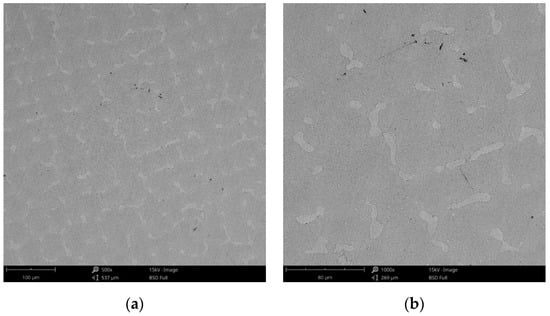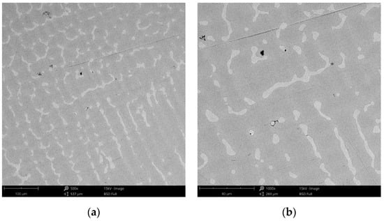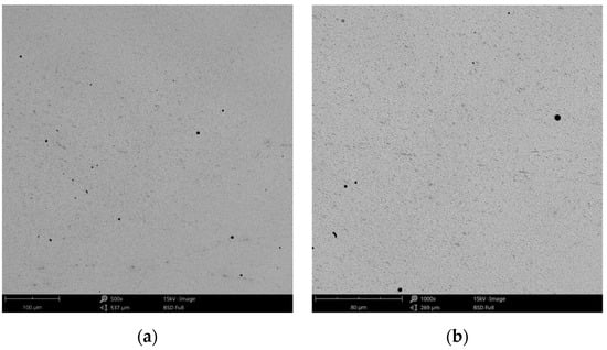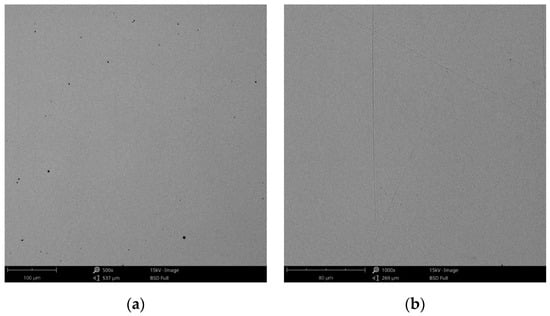 The surface morphology obtained by SEM of the two Co-Cr alloys used in the study, CCc and CCm manufactured by casting and milling, are presented in Figure 2 and Figure 3. Thus, based on the SEM images (Figure 2), it can be noted that the CCc samples show a dendritic microstructure specific to cast alloys, but also some non-metallic inclusions and micro-shrinkages (defects specific to metallic materials obtained by casting) can also be observed. Moreover, thin scratches from the polishing process were observed on the surface.