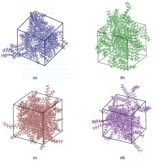 - Last, the anneal function of the Forcite module was used to backpedal asphalt molecules, in which the initial temperature is 300 K, the intermediate temperature is 500 K, and 25 cycles were carried out; the models are shown in Figure 2.