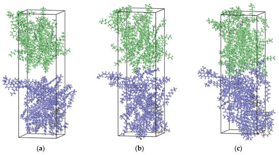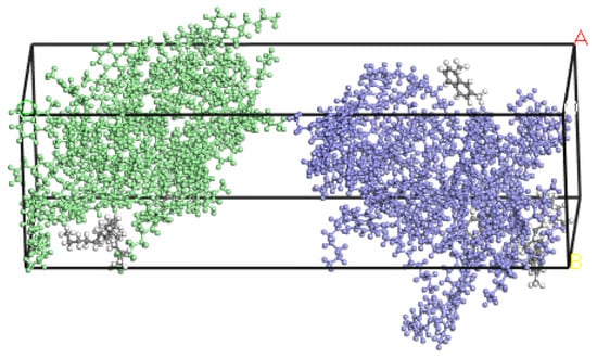 The Build Layers command was used to model the new-old asphalt contact interface. Both the new and old asphalt models were established at a temperature of 300 K. Since this paper studied the fusion effect of the interface between the old and the new asphalt in the cold rejuvenation mode, the construction temperature is usually between 10~60 °C. The simulation temperatures were selected as 283.15 K, 293.15 K, 303.15 K, 313.15 K, 323.15 K, and 333.15 K. The dynamic simulation was carried out in Dynamic, and the ensemble was NPT ensemble. The interface model between Panjin 90# asphalt and the long-term aging Panjin 90# asphalt and Zhonghaiyou 90# asphalt and the long-term aging Zhonghaiyou 90# asphalt was simulated with 200 ps, respectively. Taking 303.15 K as an example, the following Figure 4 shows the new-old asphalt contact interface.