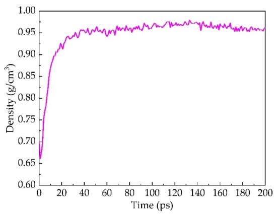 According to the proportions of different asphalt components and the molecular weight of the corresponding components, the mole ratio of each component in asphalt molecules was calculated, and the number of molecules was selected. Then the representative molecules were constructed by using the Amorphous Cell module in Materials Studio software (Version 2019, Accelrys Software Inc., San Diego, CA, USA). The dynamic simulation calculation was added due to the instability of initial intramolecular and intermolecular energies in the asphalt bitumen molecular model. However, the incompatibility of structural calculation can lead to failure of the model, requiring the optimization of the asphalt molecular geometry configuration to obtain a more reasonable configuration. It is still necessary to anneal the asphalt molecules to reduce their energy considering the complex molecular structure inside the asphalt. After that, the dynamics simulation calculation of asphalt molecules was carried out. The specific steps are as follows: