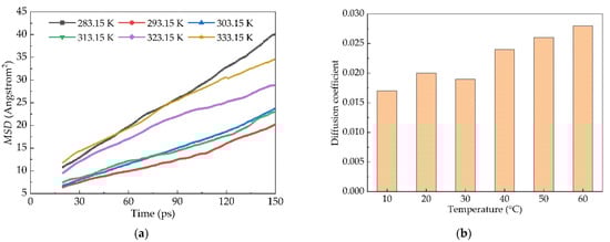 where <r2> represents the mean azimuth shift, D and C represent constants, <> represents the mean and r represents the displacement. The diffusion coefficient of the model cannot be directly obtained by molecular simulation. After the data of MSD is derived according to the above formula, the slope of the MSD is calculated by linear fitting, that is, the mean azimuth shift. The 1/6 of the mean azimuth shift is the diffusion coefficient [53,54].