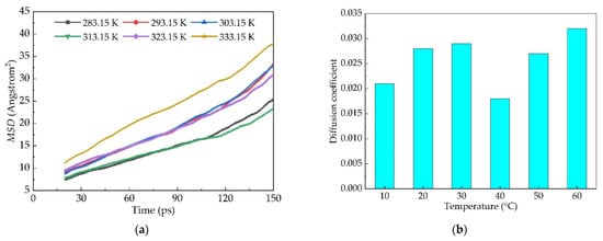 Considering the sharp rise in the first 20 ps and the final curve being slightly upward, according to the MSD curve, 20 ps~150 ps sections were selected and Origin software was used for linear fitting of the MSD images. As the temperature rises, the diffusion of old asphalt to new asphalt also shows an upward trend. The diffusion coefficient of old asphalt to new asphalt increases by 10.5% with the increase in temperature at 10 °C by linear fitting, as shown in Figure 8.