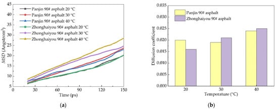 Comparison diagram of two asphalt MSD diagram and diffusion coefficient: (a) the dependence of MSD as a function of time and (b) the dependence of diffusion coefficient as a function of temperature.