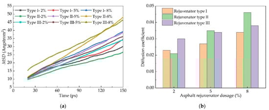 MSD of different rejuvenators and their diffusion coefficient: (a) the dependence of MSD as a function of time and (b) the dependence of diffusion coefficient as a function of rejuvenator dosage.