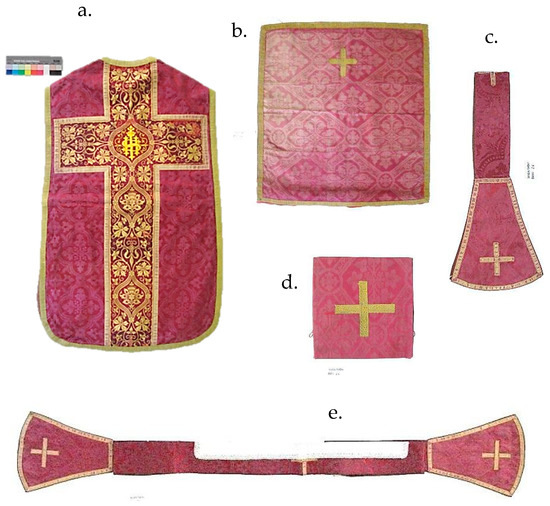 Set of liturgical vestments: (a) chasuble, (b) velum, (c) maniple, (d) burse and (e) stole.