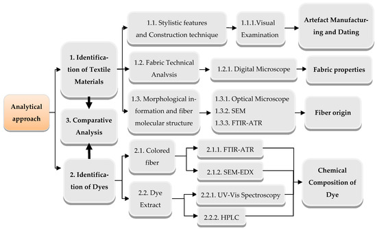 Finally, a comparative analysis was applied to identify and match textile fabrics, yarns, fibres and dyes in order to confirm their authenticity and to establish common features (Figure 2, block 3).