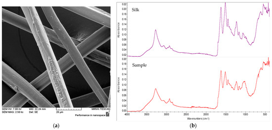 The surface morphology of all fibres was investigated using optical and scanning electron microscopy. It was found that analysed warp samples (Sample 1, 3, 5 and 7; Table 1a–d) correspond to the protein-based silk fibres (Bombyx mori, Figure 3a), which have also been confirmed by FTIR-ATR analysis (Figure 3b). Using OMNIC Spectra Software, the statistical discriminant analysis was performed determining that the similarity percentage of the silk fibre spectra from the database compared to each fibre from the warp sample is around 70%.