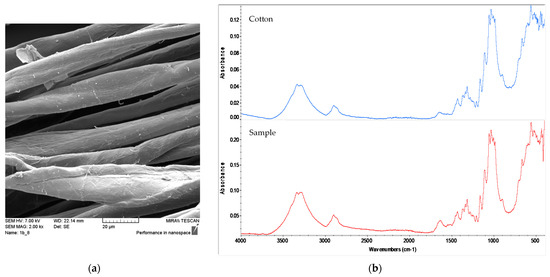 Cotton weft from Fragment 2, sample 8: (a) SEM photograph; (b) FTIR-ATR spectra of reference cotton and sample (red).