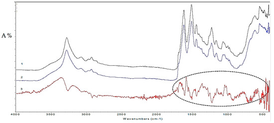FTIR-ATR absorption spectra: 1-undyed sample of reference silk fibre, 2-Sample 1, 3-dye spectrum obtained by spectral subtraction of reference silk spectra from the coloured sample spectrum.
