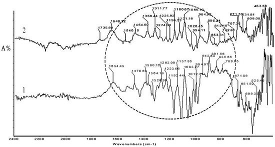 FTIR-ATR absorption spectra: 1-Sample 9, 2-Sample 10.