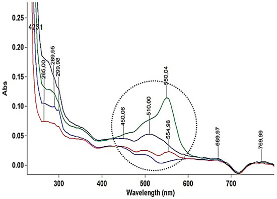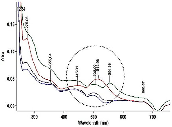 Vis spectra of all cotton weft samples show some similarities and intense absorption bands in the region around 500–550 nm (Figure 8).
