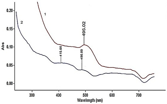 UV-Vis absorption spectra of samples from subsequent sewing interventions: 1-Sample 9, 2-Sample 10 (Velum).