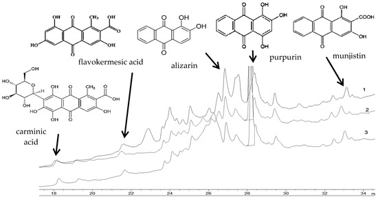 Results indicate that the most dominant identified colorants in Sample 1 (silk warp) are anthraquinones alizarin and purpurin. In addition, a peak at 33 min is attributed to pseudopurpurin or munjistin, all derived from the root cultures of Rubia tinctorum L. (Table 3, Figure 11). During the dyeing process, alizarin forms a complex with metal ions such as aluminium, which is identified by SEM-EDX analysis (Figure 5). However, two more peaks were observed at lower retention times in the HPLC chromatogram: carminic acid (rt = 18 min) and flavokermesic acid (rt = 21 min) (Table 3, Figure 11). This result confirms that the dye used in the Sample 1 is the madder and cochineal dyes.