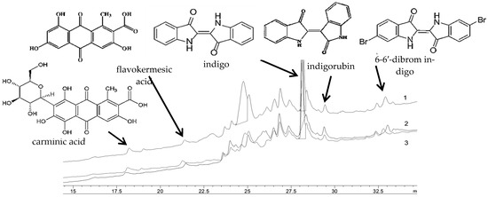 For weft cotton samples (Sample 2, 4, 6 and 8), the analytical method with a reducing agent was used to prove the characteristic behaviour of indigoid dyes. Treatment with a reducing agent yielded yellow-green “leuco indigo” form, which then changed to a bluish tone by the processes of oxidation. The major chromatographic peaks seen in those samples showed characteristic retention times at 28.2 min of indigotin, at 29.40 min of indigorubin and at ~33 min of 6,6′-dibromindigo, all characteristic for the Murex sea snail dye (Figure 12). The peak eluted at 18 min was marked as carminic acid and the peak at 21 min as flavokermesic acid (Figure 12). Based on the obtained result and data available in the literature, those compounds indicate the presence of the cochineal dye. Considering the fact that those weft cotton samples contain all chromophore groups mentioned above, it is confirmed that the extracted dye is a mixture of dyes from and cochineal.