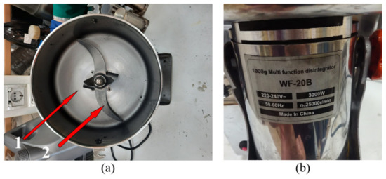 The centrifugal paddle mixer “WF-20B”: 1 is the capacity; 2 is the paddle. (a) view from above; (b) side view.