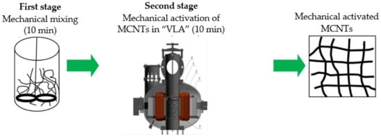 Mechanical activation can lead to a change in the aspect ratio, the degree of defectiveness, and fragmentation or alignment of agglomerates in MCNTs. In this case, mechanical activation will allow the creation of uncompensated chemical bonds or free radicals with a reserve of “excess” energy [].