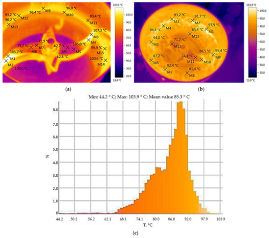 Thermal images of centrifugal paddle mixer “WF-20B” in working: (a)—without material; (b)—thermal field with material; (c)—a temperature histogram of the paddle mixer.