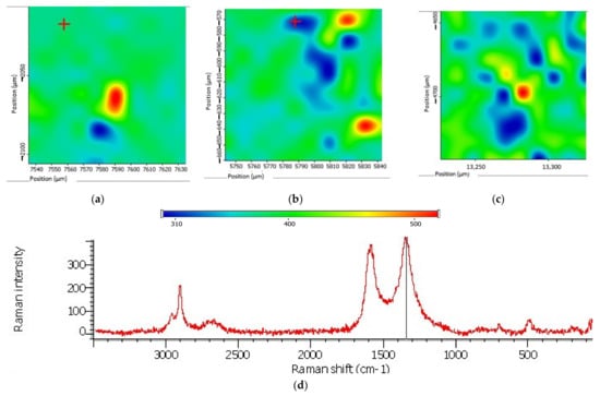 Raman mapping of the surface of an organosilicon compound with MCNTs: (a)—manual stirring; (b,c)—first and second stages of mechanical activation, respectively; (d)—Raman spectra.