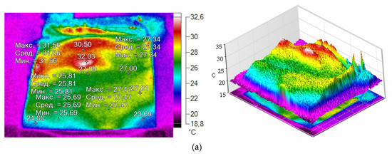 From the data presented in Figure 9a, it follows that the sample, into which MCNTs with graphite is introduced by manual stirring, is characterized by an uneven distribution of the temperature field, with locations that heat up to 32.6 °C and locations that do not heat up, having a temperature of 23 up to 25 °C (Figure 9a). The elastomer supply voltage is 100 V.