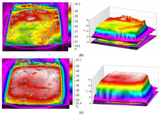 The temperature field distribution was studied through the contactless measurement method using a Testo-875-1 thermal imager (Testo, Schwarzwald, Germany) and Fluk Ti9 (Fluk, Everett, DC, USA). The temperature was preliminarily measured with a two-channel Testo 992 thermometer (Testo, Schwarzwald, Germany). The surface temperature was determined, and based on the data obtained, it was compared with the temperature recorded by the thermal imager, whereupon the emission coefficient was selected to be used in further measurements. The resulting thermograms were processed using the IRSoft v.4.7 PC software (Testo, Schwarzwald, Germany).