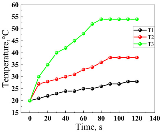 Dynamics of the temperature change on the surface of heaters: T1—elastomer with MCNTs and graphite; T2—temperature histogram for elastomer with MCNTs and graphite: the 1st stage of mechanical activation; T3—elastomer with MCNTs and graphite: the 2nd stage of mechanical activation.
