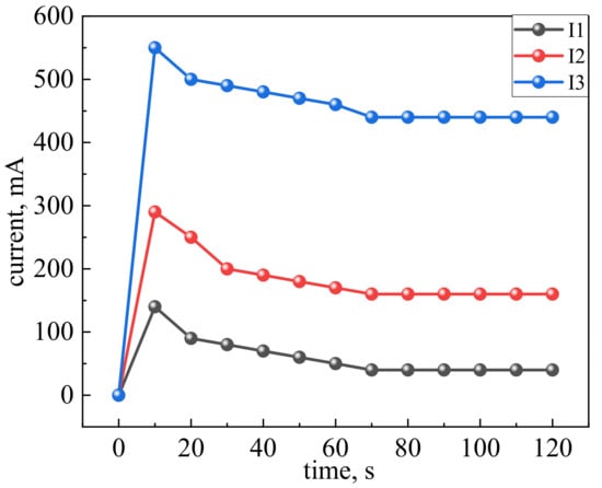 From the data presented in Figure 12, it follows that the highest starting current corresponds to an elastomer with MCNTs and graphite at the second stage of mechanical activation, which is a consequence of a more uniformly formed electrically conductive network. The smallest value is typical of the first sample since it has separately isolated locations of the heat release, which form the level of the starting current that is in this sample. For the second sample, the starting and rated current increases since more pronounced areas of the heat release appear, which indicates the transition of the electric current into thermal energy. The multiplicity of the starting current Ip to the nominal In (Ip/In) is 5 for the first sample, 7.5 for the second sample, and 10 for the third sample at the supply voltage of 100 V. Thus, the starting current or activation current it is the minimum amount of charge or energy at the initial moment of the time, after this time the heating mode is exited. The effect of a decrease in the starting current and temperature stabilization indicates the presence of self-regulation, which is expressed in maintaining a certain level of temperature.