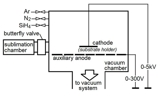Scheme of the PE CVD equipment used during coating deposition, ZIP 12 type with sublimation chamber.