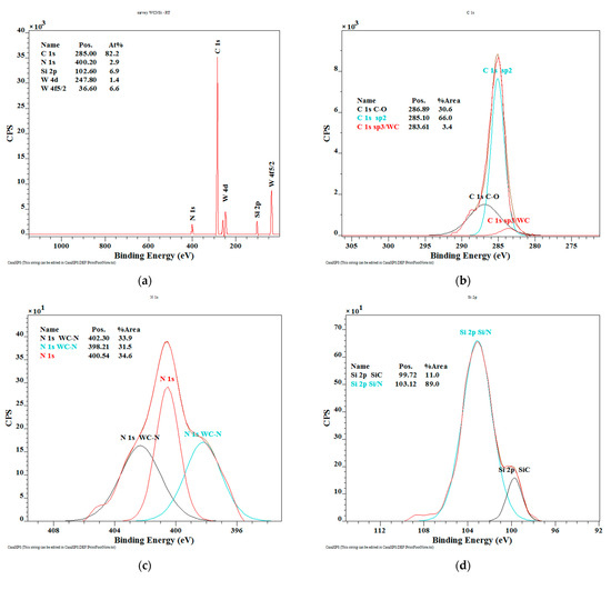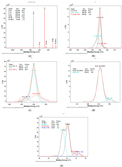 In addition, the obtained results (Figure 4b) show the presence of hard WC and diamond phase (3.4 at.%), graphite phase of C (66.0 at.%), and phase of C-O (30.6 at.%). The high-resolution spectrum of N 1s nitrogen (Figure 4c) shows the presence of hard WC-N (65.4 at.%) and nitrogen oxide (34.6 at.%). The spectrum of silicon Si 2p contains two peaks (Figure 4d), and peak with a value of 99.72 eV (11.0 at.%), which is characteristic for the SiC phase and confirms the binding of silicon in a thin layer. A peak of 103.12 eV (89.0 at.%) is characteristic for the silicon nitride phase. The high-resolution spectrum of W 4f tungsten is divided into four peaks (Figure 4e), i.e., peaks with values of 38.85 eV (18.4 at.%) and 36.59 eV (48.4 at.%) are characteristic for nitrogen-bound tungsten. In addition, the tungsten carbide compound is confirmed by peaks of 33.99 eV and 32.16 eV (20.8 at.% and 12.5 at.%). These results are in good agreement with results for C deconvolution [39], N convolution [40], and W convolution [41].