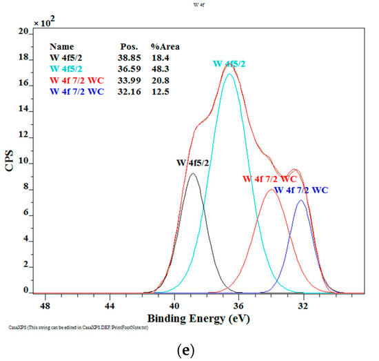The high-resolution spectrum of tungsten W 4f (Figure 5e) is divided into four peaks, i.e., values of 3572 eV (50.7 at.%) and 3783 eV (42.4 at.%) are characteristic for oxygen-bound tungsten. The tungsten carbide compound is confirmed by a peak at the value of 32.64 eV (3.7 at.%) and at the value of 30.65 eV (3.2 at.%).