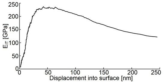 The maximum HIT value of the deposited coating is 18.7 ± 4.3 GPa as compared with that obtained by other studies, namely [8] (18.0 ± 3.1 GPa) and [17] (22.1 ± 2.5 GPa), where thin layers were obtained using the DCMS and RFMS techniques, respectively. Simultaneously, the hardness is 30% lower as compared with the hardness of the WC/C coatings deposited using the PE CVD method with and without adding Ar in a gas mixture [27]. Young´s modulus of the tested samples is 220 ± 17 GPa (Figure 8).